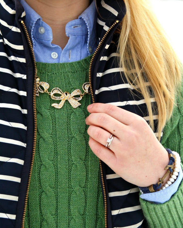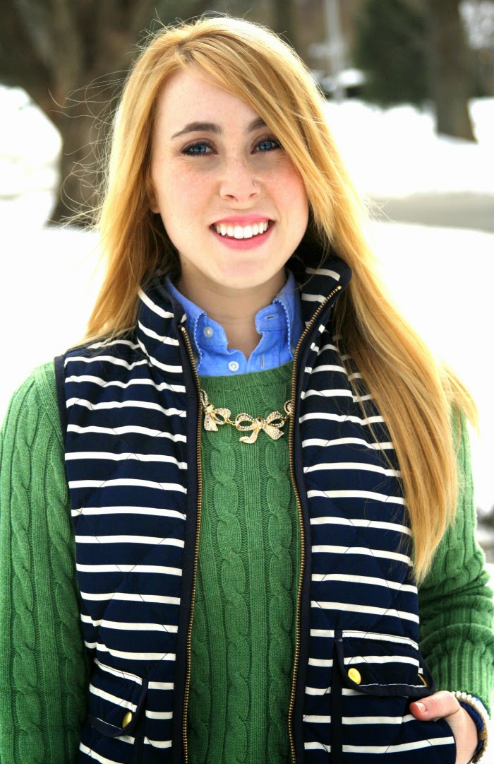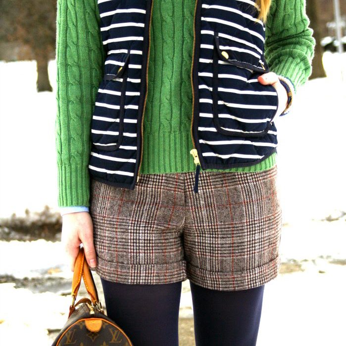 sweater:  Ralph Lauren, similar | button down:  Ralph Lauren | vest:  J.Crew Factory, similar here | shorts:  Calypso Boutique, love these | shoes:  Sole Society, love these | tights:  Target | necklace:  Purple Peridot | bracelets:  Kiel James Patrick and The Diamond Galleria | lipstick:  Estée Lauder