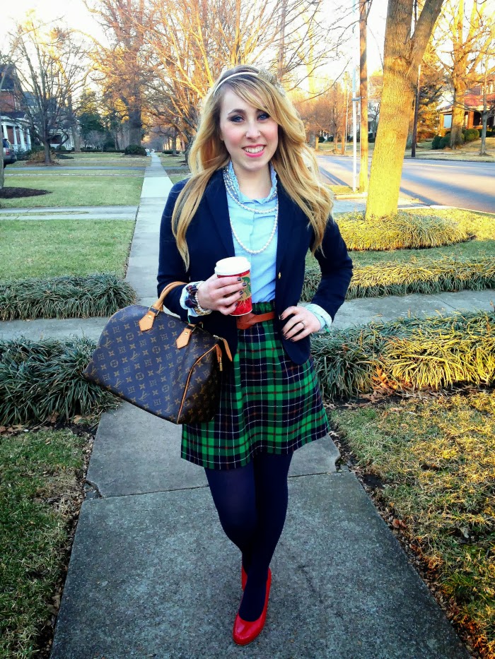 Shirt: Kohl’s (similar) | Blazer: Gap (similar) | Skirt: J.Crew (love this one) | Bag: gift | Shoes: Tamaris (similar, love these) | Tights: Target | Pearls: heirloom | Bracelets: J.J. Walters Designs, Brooks Brothers, gifted | Headband: J.Crew (old)