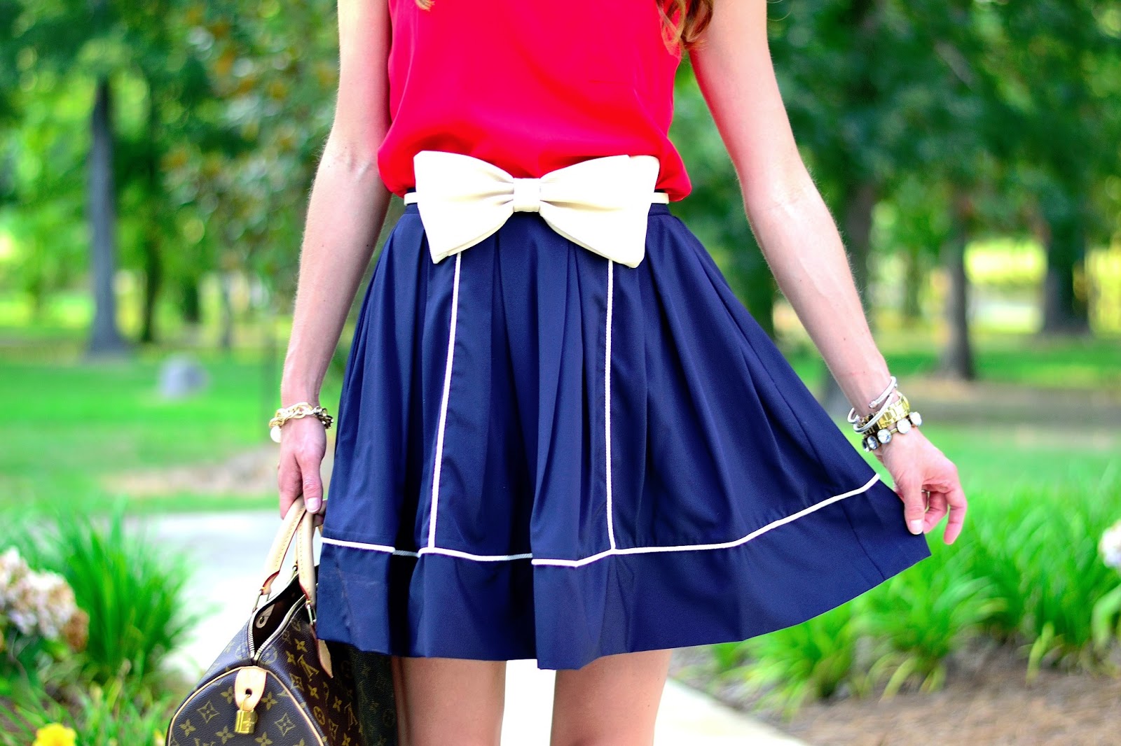 I am SUPER excited about her outfit for today, it’s patriotic without going overboard, and it’s perfect for hot, humid weather. And I really want to steal her belt! (I am a bit bow obsessed).