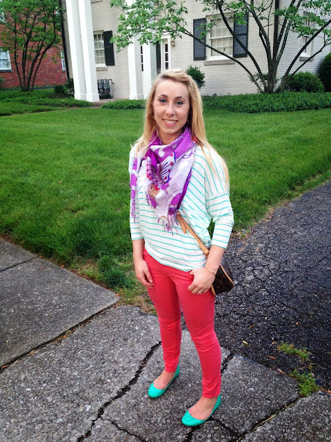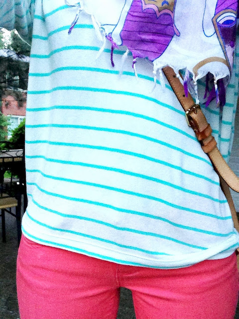 The top is paired with coral skinny jeans (coral + turquoise = trendy, oh yeah!), and a printed scarf to complete the look.  Definitely one of my go-to outfits, and European chic!