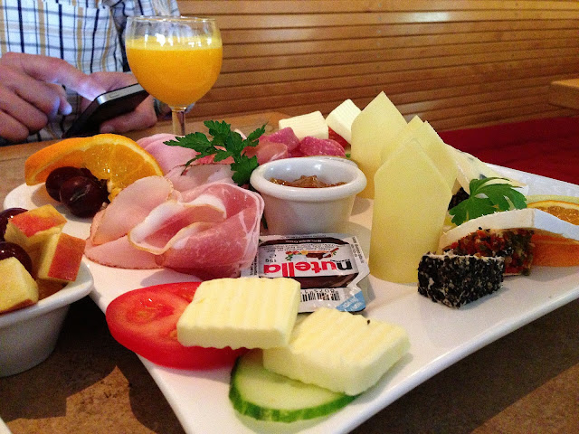 Seriously, look at this brunch! We had two plates like this to split between the four of us, and fresh bread. And did I mention that the orange juice was freshly squeezed? And the presentation of the food is always fantastic! The cheeses and different types of sausages and fruits are never just thrown on a plate, they are always neatly arranged in a presentation that is pleasing to the eye and, in my opinion, makes eating the meal more enjoyable.