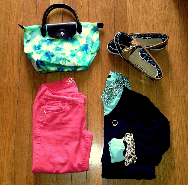I started out with the turquoise embellished button down and built my wardrobe around it.  I picked my pink skinny jeans to add another dimension of color (and the brightness of pink was calling to me!).  To pull the turquoise top and pink jeans together, the navy pullover was added on top.