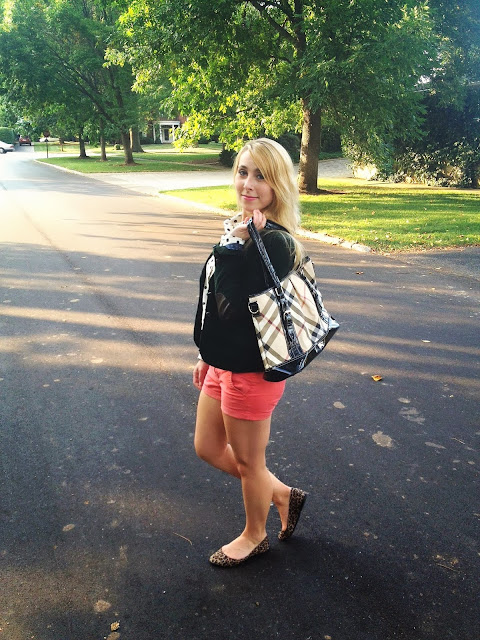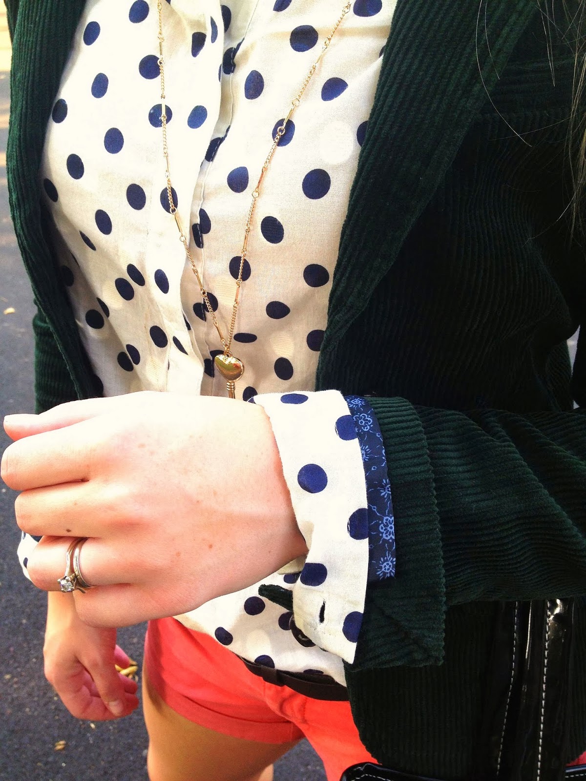 As you can tell from most of my posts the past couple of weeks, I am all about transition outfits for fall. Taking a summer staple like these coral twill shorts and adding some fall colors like beige and hunter green instantly turns them into fall-appropriate.