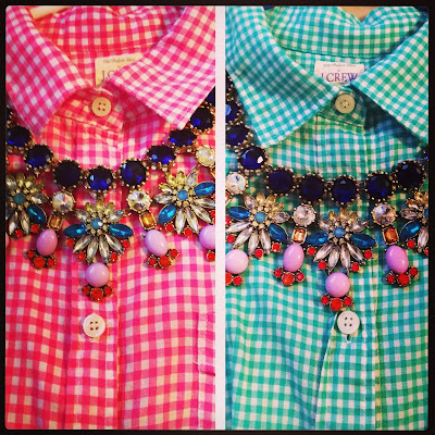 I love how you paired this necklace with the colored gingham! I don't know if I would have thought of that, but it looks so great! I've recently discovered some online Etsy boutiques (with the help of some blogger friends…) that have pieces that look JUST like J. Crew. I suppose I should feel bad that I'm buying from a knockoff artist, but, then again, I think J. Crew should feel bad for making their stuff so expensive!