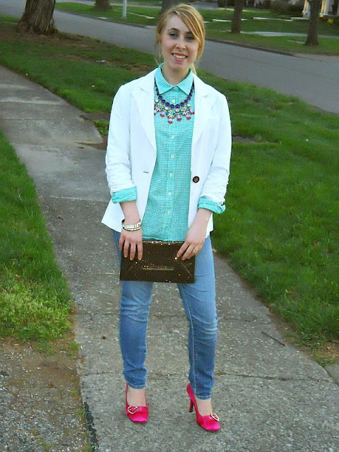 OH. My. GOSH. I can see why you are over the moon for that necklace – it's amazingggg! I like the green but would LOVE it with the pink. Your white blazer is just the icing on the cake for me. Great job!! ๐Ÿ™‚ Found you via the Real Girl Glam linkup! ๐Ÿ™‚