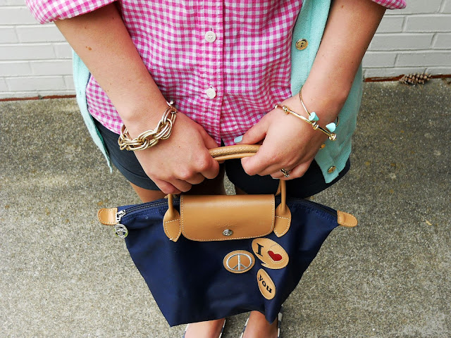 I own that pink gingham shirt and those striped shoes ๐ I love how you put this together, turquoise and pink are my two fav colors to wear and the scarf is perfect.