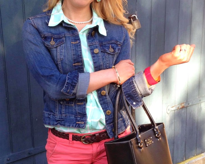 For today’s outfit, Fridays are casual days, I will switch out the shorts for these longer boyfriend shorts to make the outfit a bit more professional :D. Love me some bright colors, and mint and coral just happen to be my top favorite color combination! The denim jacket helps to bring all of the pieces together and give this rather billowy blouse a more feminine structure.