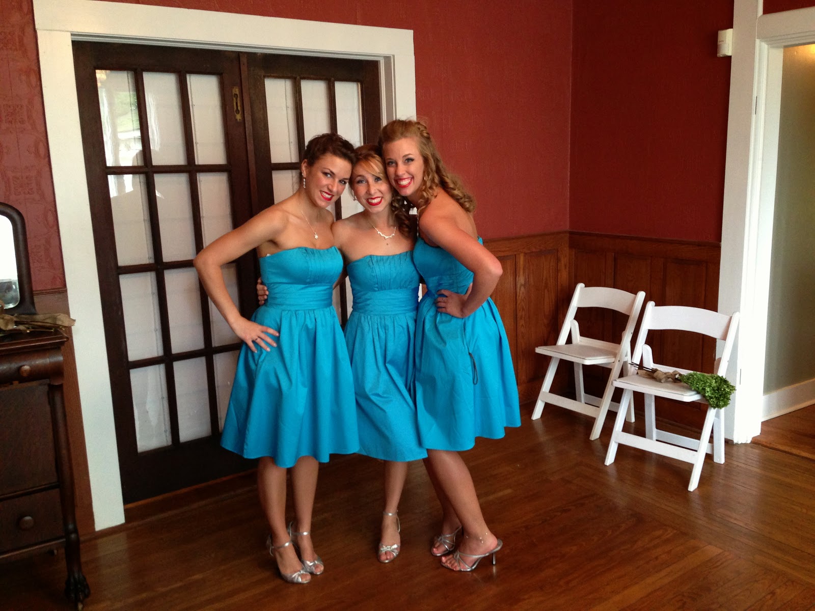 Friday: THE BIG DAY!!! Um, let me just say that it did not start out very well. It rained POURED until an hour before the ceremony was supposed to start, so we were a couple of hours late taking pictures. While R (maid of honor) helped The Bride get ready, I helped the groomsmen fold their pocket squares…They were clueless, and I was happy to help. ๐ The Bride was stunning in her dress, and she had that wedding glow, and all of us girls could not believe this day had finally come. We had a blast taking pictures, and before we knew it, it was time to line up and begin the ceremony. The wedding went off without a hitch, except the music started skipping when I began to sing, so we just started over, but it was beautiful. I sang “Only Hope”, if anyone was wondering. I still can’t believe I made it through without crying! The reception was held in a rustic red barn that is on site, and it was decorated with white paper lanterns, cascading lights, and mason jars that The Bride and I had put together. Again, I could kick myself for not taking more pictures than I did!