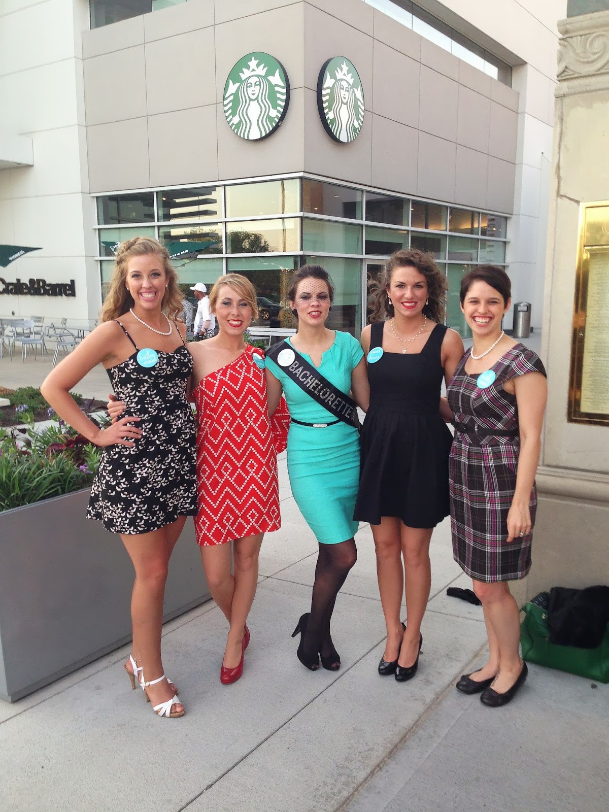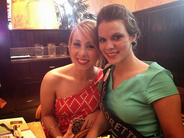 Wednesday: Wednesday, two of my best friends, we’ll call them R and C, caravanned up to Indianapolis from southern Indiana. When we finally checked into the hotel, we discovered that we only had an hour to get ready for the bachelorette party and BE there…aaaand we didn’t even have the Bride’s gift wrapped. Yikes. Needless to say, we were all in a panic, and I still had no idea what I was going to wear. It was supposed to be a 40s themed party with a modern twist, and thanks to my Closet Remix Challenge, I couldn’t go shopping for anything. So I threw on my one-shoulder chevron shift dress (say that five times fast), which is more 60s than 40s, and headed to the Cheesecake Factory. COMPLETELY in love with my dress!