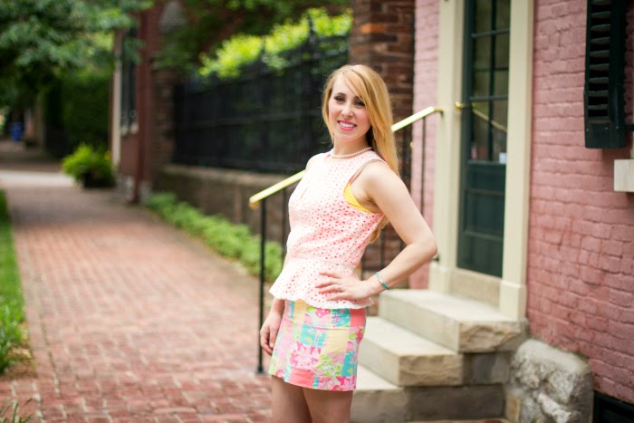 peplum:  Hot Pink Hanger, c/o | skirt:  Lilly Pulitzer via eBay, similar here and here | sandals:  Jack Rogers | pearls:  gift | bracelet:  Voce (local boutique), love this one