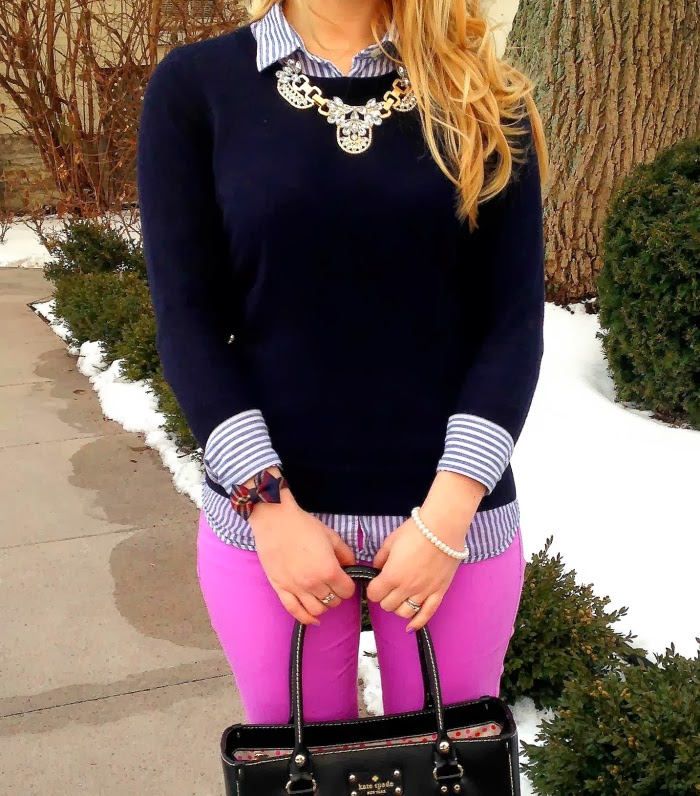 pullover:  J.Crew Factory (similar) | button down:  J.Crew Factory (similar) | denim:  Old Navy (on sale for $12.97 with an additional 30% off!!!) | handbag:  Kate Spade (similar, exact) | shoes:  Tamaris (similar splurge, save, steal) | necklace:  The Crystal Feather Boutique, c/o (exact) | bracelets:  Brooks Brothers, and gifted ring:  Forever 21 | nail polish:  Revlon in Enchanting, love this one