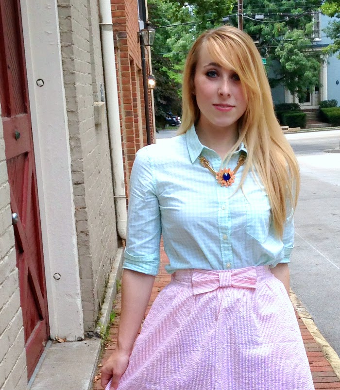 Let’s talk about this skirt….Seersucker, and a bow. I could just stop there, and that be enough to hook anyone, BUT it gets even better; it has pockets; and January’s skirts are all custom made, meaning you give her your waist and length measurements, so it is literally made to fit. If you haven’t checked out January’s Etsy shop, you really are missing out on one of the best shops for preppy, colorful summer skirts!