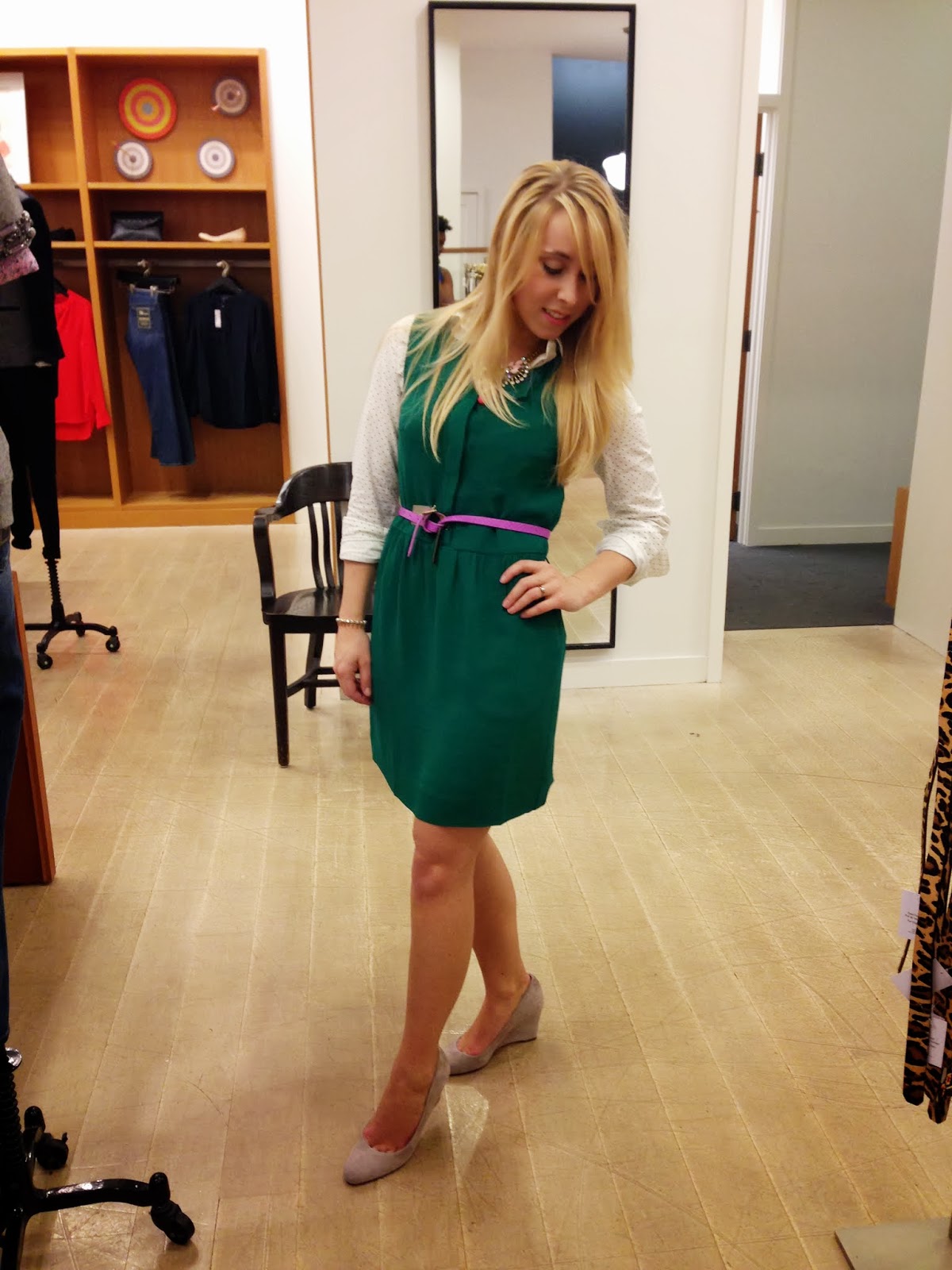 This second look is more my style, very classy, preppy, and perfect for the teaching profession!  I put this emerald sheath dress over a polka dotted oxford shirt, and added pops of color with my accessories to keep the look from becoming too buttoned-up school-teacher-y.  I  The crystal fan necklace added a little sparkle and pink, and a stylist added the neon amethyst belt.